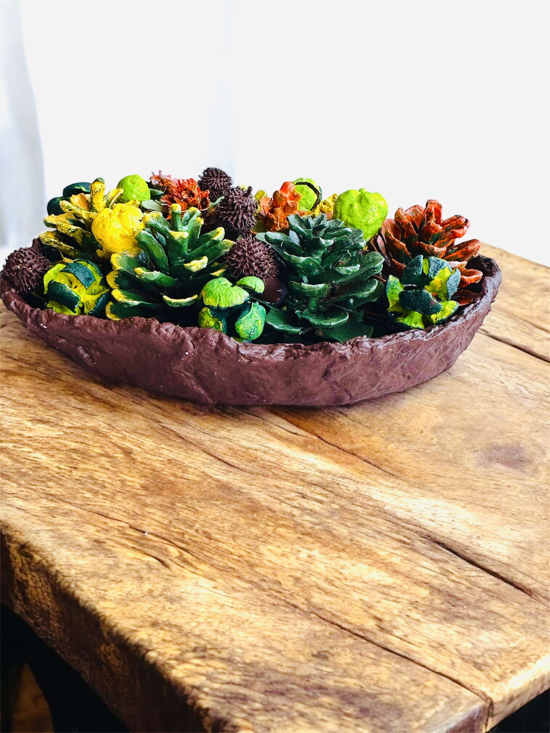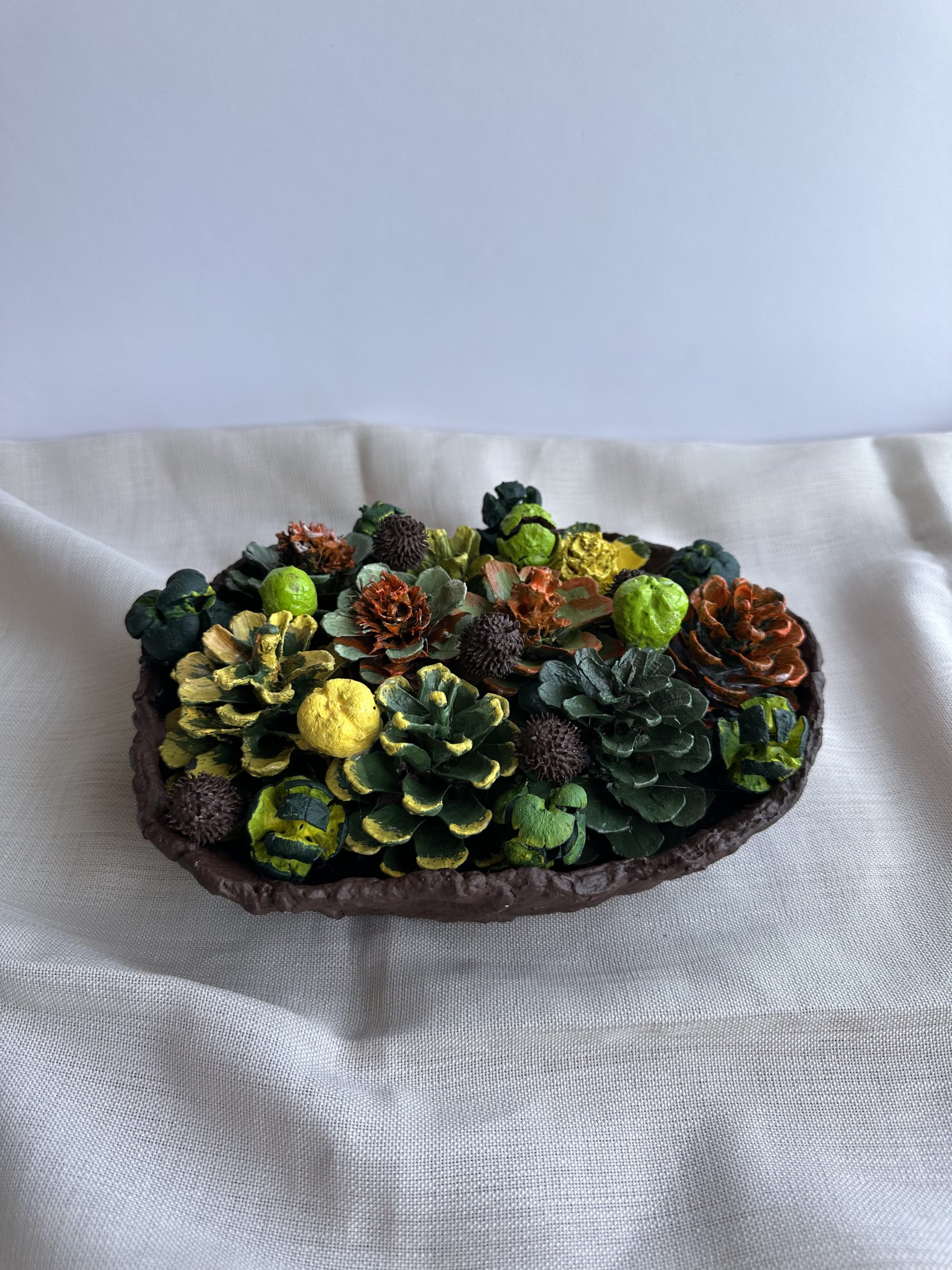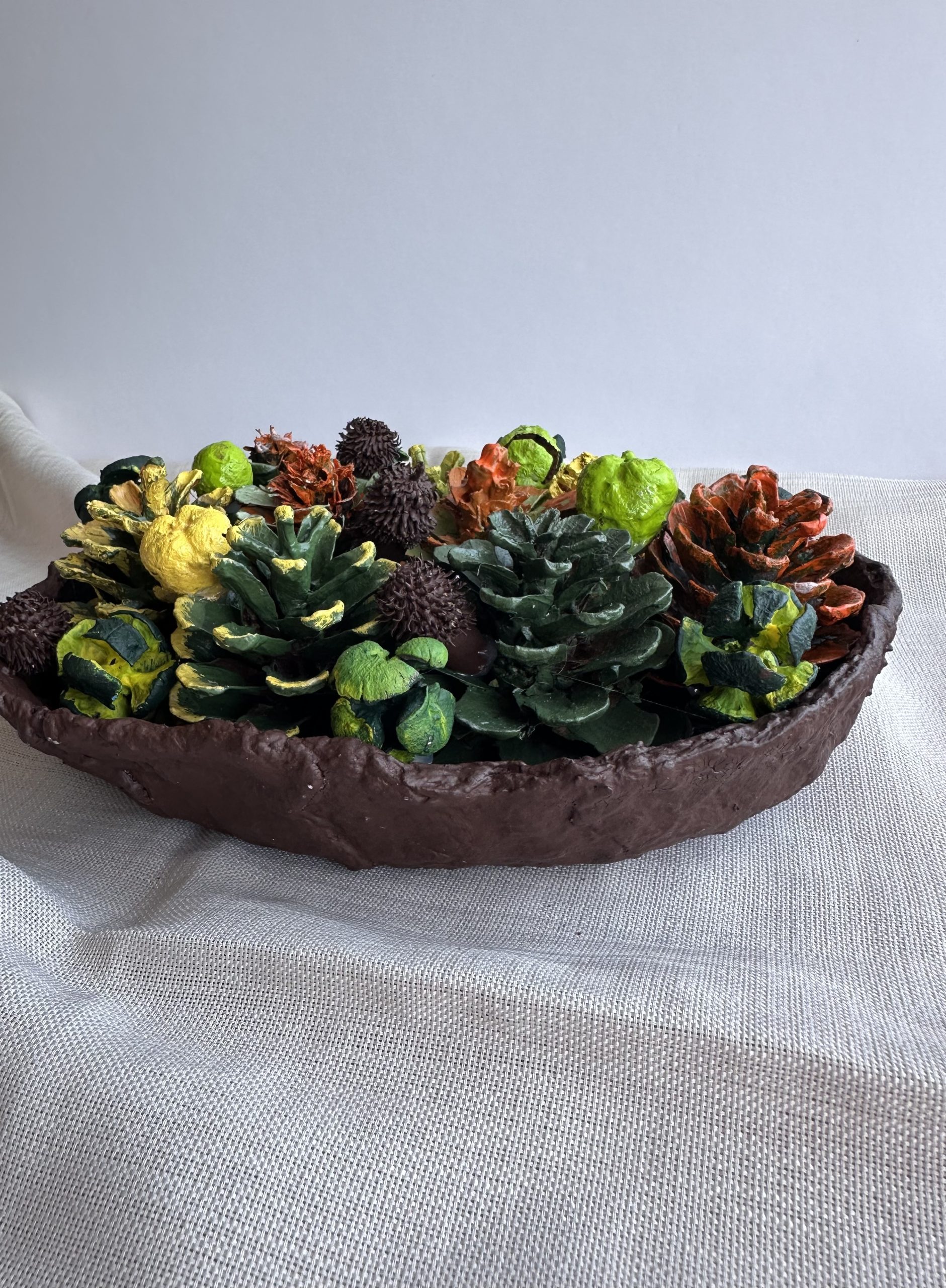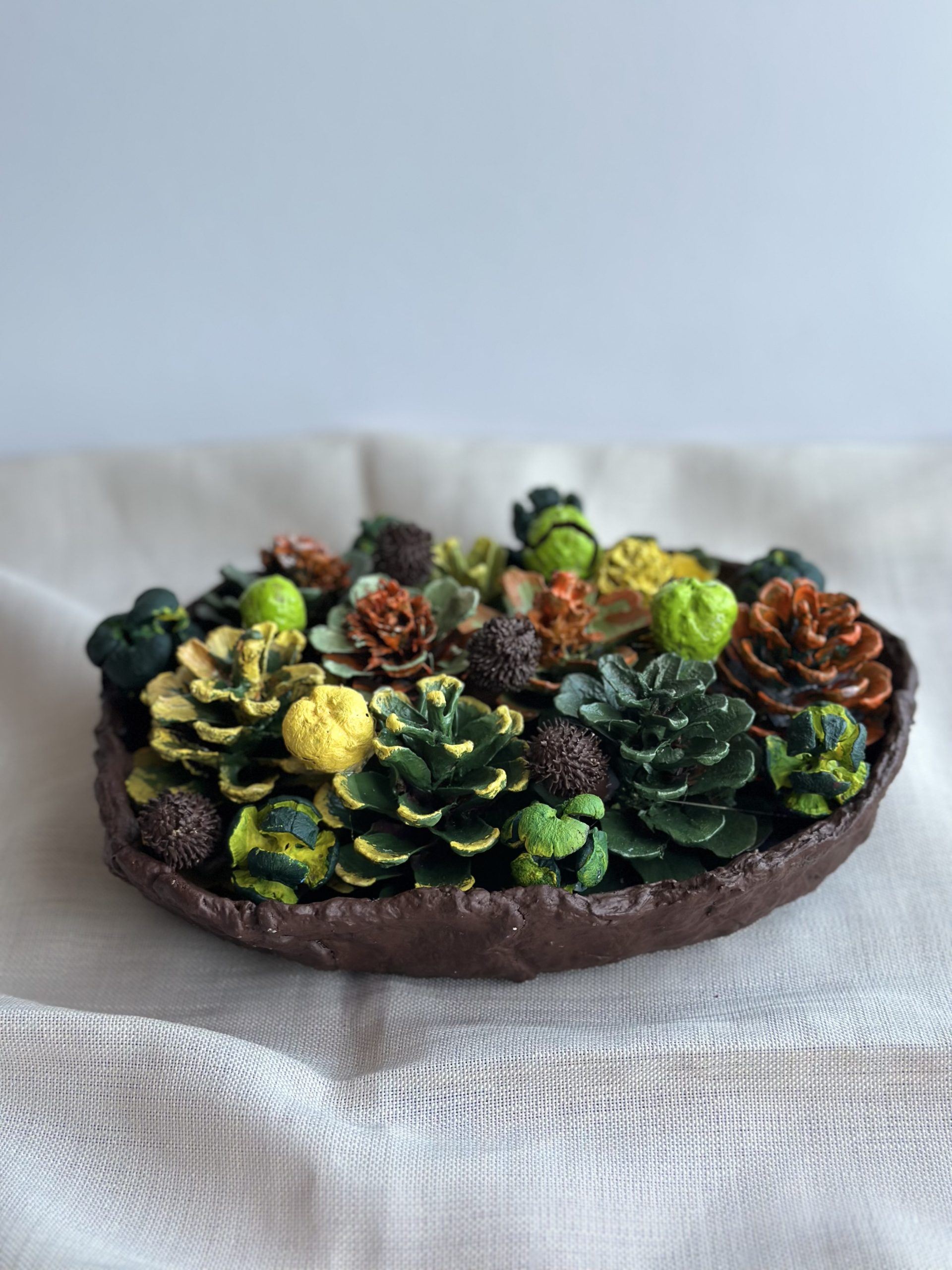 Atıl durumda bırakılmış kozalaklar, tohumlar ve doğal formlar, usta ellerde yeniden şekillenerek Gaia’nın Tabağı’nda bir araya geldi. Ne boya rastgele seçildi, ne de form tesadüflerle oluştu. Her detay, doğanın döngüsünü ve yeniden doğuşunu simgeliyor.