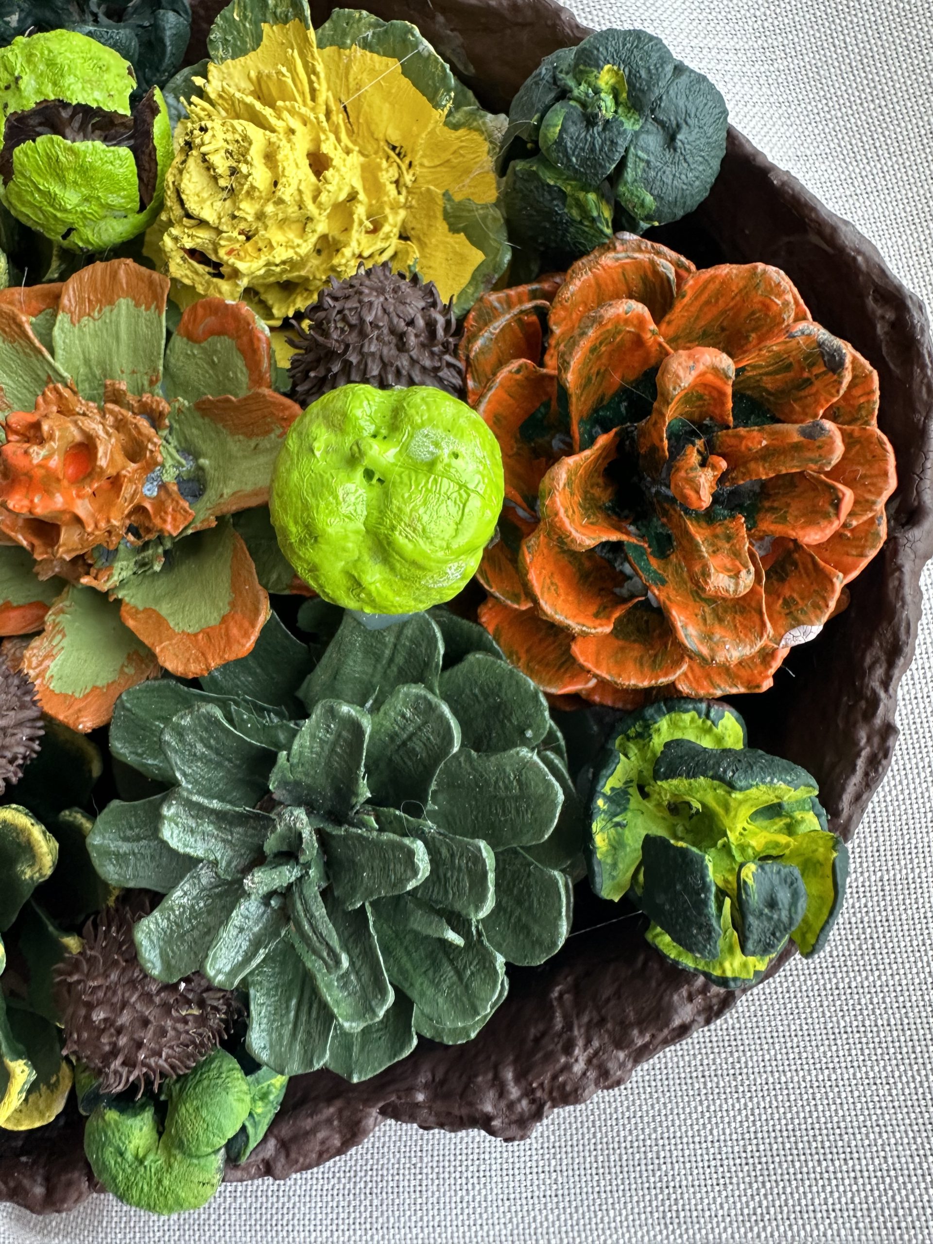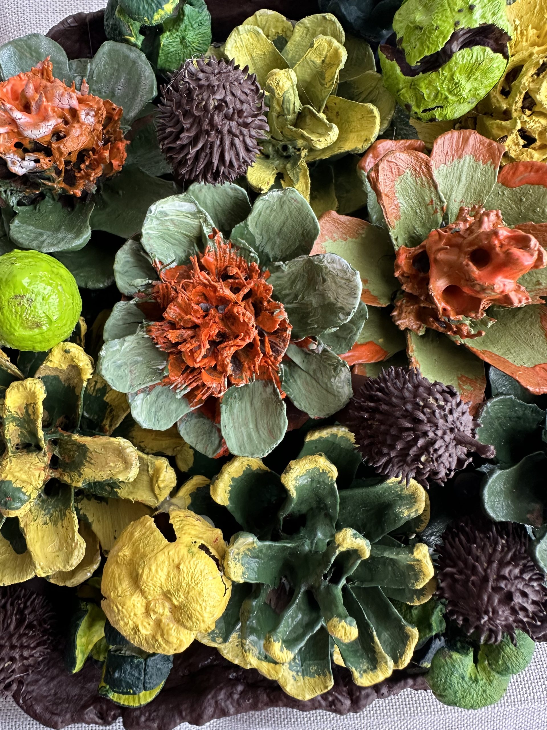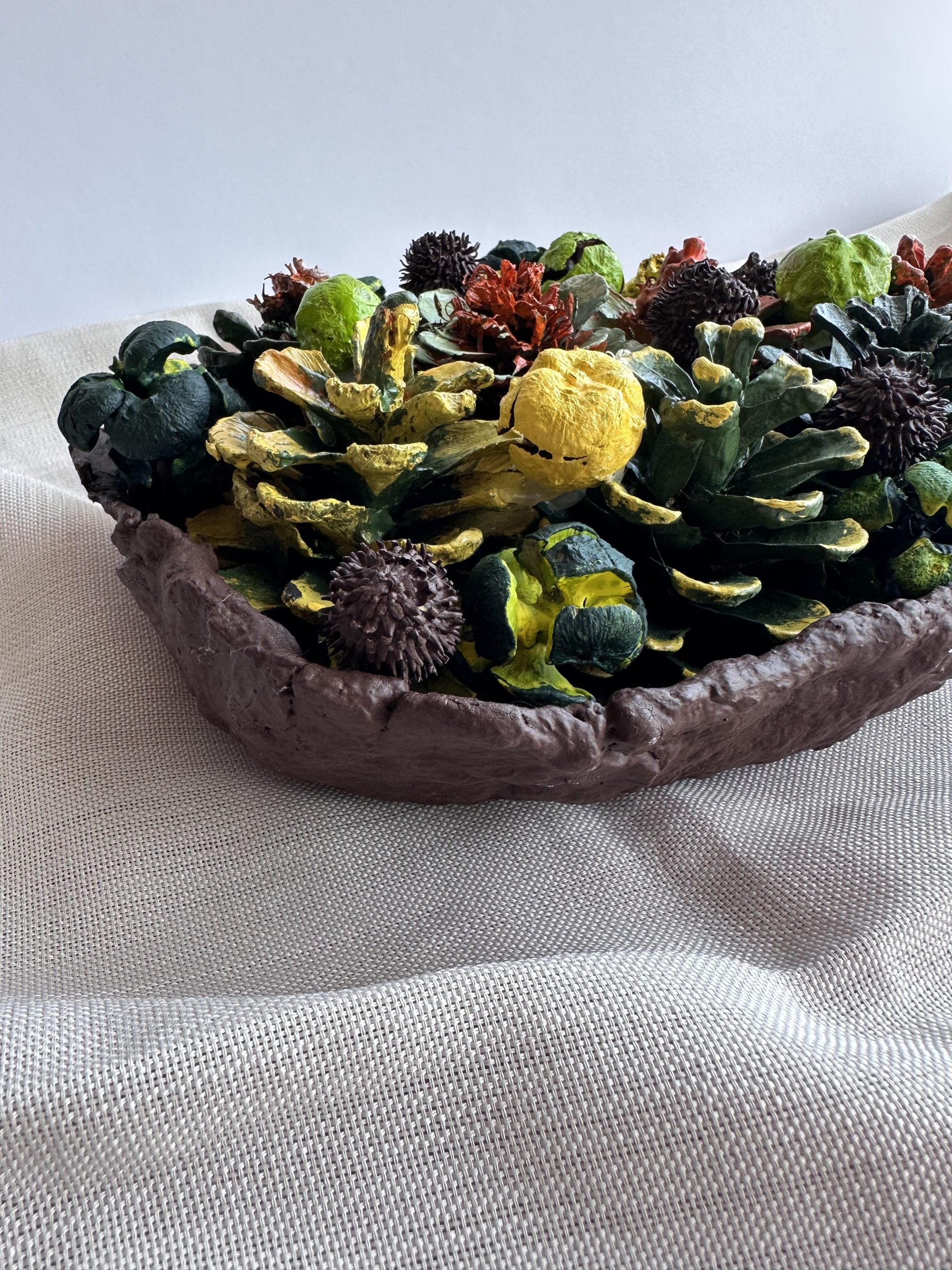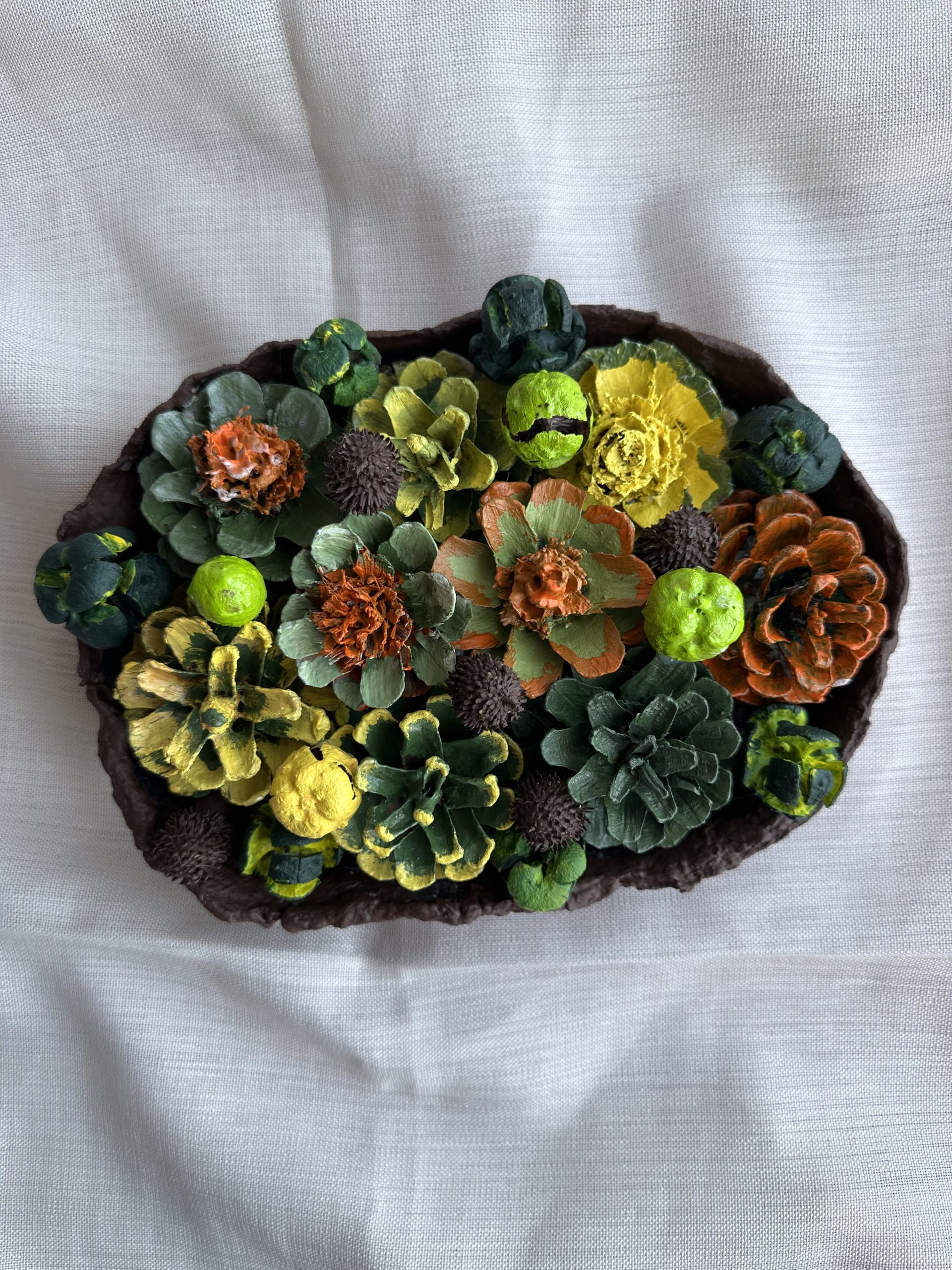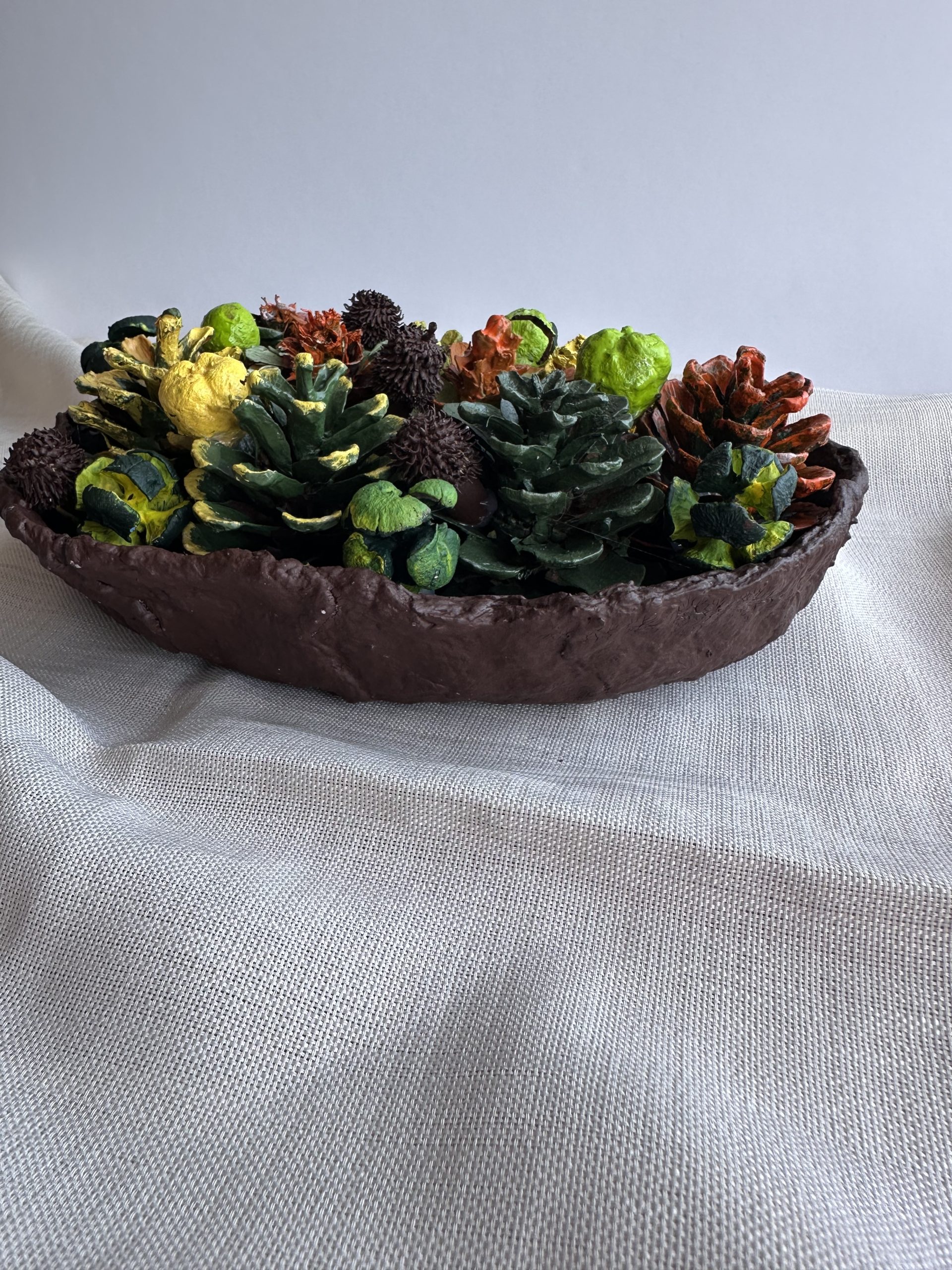Atıl durumda bırakılmış kozalaklar, tohumlar ve doğal formlar, usta ellerde yeniden şekillenerek Gaia’nın Tabağı’nda bir araya geldi. Ne boya rastgele seçildi, ne de form tesadüflerle oluştu. Her detay, doğanın döngüsünü ve yeniden doğuşunu simgeliyor.