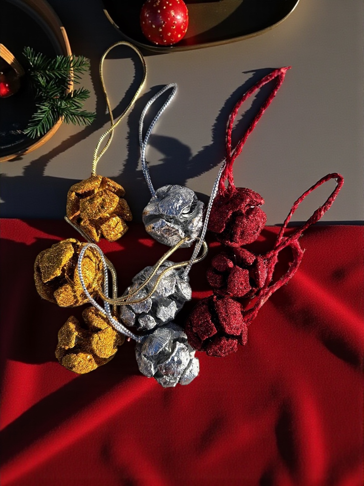 - GELENEKSEL TASARIM: Her biri el yapımı , kırmızı, altın ve gümüş renklerde parıltılı kozalak süsler, klasik Noel temasını yansıtır