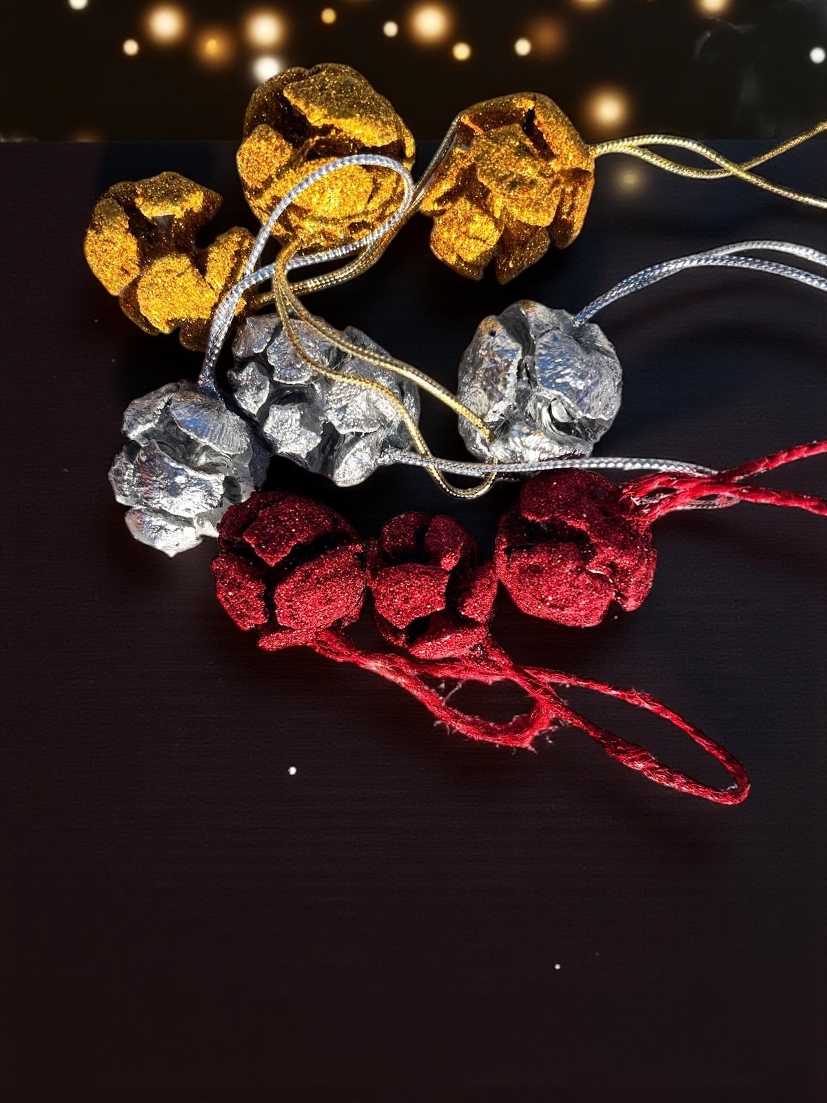 - KOLAY ASILIR: Her kozalak süsün üzerinde altın ve gümüş renkli iplik askılar, ağaca kolayca asılabilir